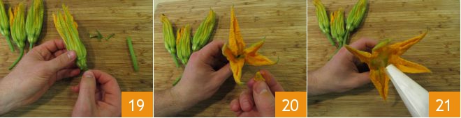 Em seguida, passe para a limpeza das flores de abóbora: remova o caule, os pedúnculos na base da flor 19 e o pistilo interno 20. Recheie as flores com a ricota 21,