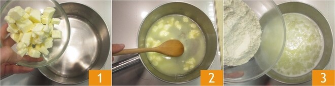 Para preparar as tortinhas fantasma com Grana Padano, comece pela massa brisée: coloque a água e a manteiga em uma panela 1 e derreta em fogo baixo 2. Quando começar a ferver, adicione 150 g de farinha de uma só vez 3.