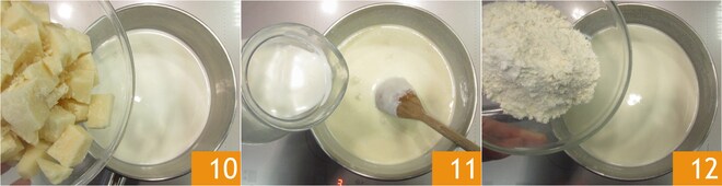 Coloque 100 g de creme de leite em uma panela, adicione o Grana Padano DOP 10 e derreta em fogo bem baixo. Quando quase tudo estiver derretido, adicione o leite 11 e a farinha 12.