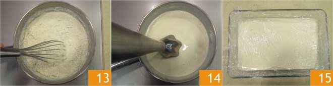 Aumente ligeiramente o fogo e continue mexendo com um batedor manual por mais 5 minutos 13. Desligue o fogo e bata com um mixer de imersão 14, depois transfira o creme para um recipiente baixo e largo e cubra com filme plástico em contato direto 15. Deixe esfriar na geladeira por pelo menos uma hora.