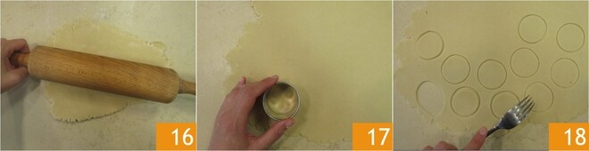 Enquanto isso, recupere a massa brisée e abra com um rolo em uma superfície levemente enfarinhada até atingir uma espessura de 5 mm 16. Corte a massa com um cortador de 5 cm de diâmetro 17 e fure os discos com um garfo 18.