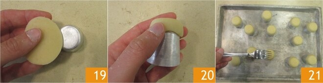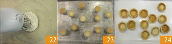 Agora pegue forminhas com uma base de 3 cm de diâmetro e modele cada disco na parte inferior 19, certificando-se de que adere bem aos lados 20. Coloque as forminhas com a base virada para cima em uma assadeira e fure a massa com um garfo 21. Asse em forno estático pré-aquecido a 170°C por 20 minutos.