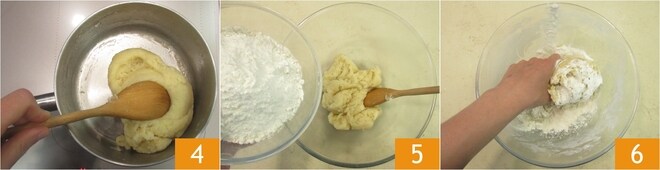 Misture rapidamente com uma colher de pau até obter um composto liso e compacto 4. Transfira a mistura para uma tigela e adicione, aos poucos, os 300 g restantes de farinha 5, amassando com as mãos 6.