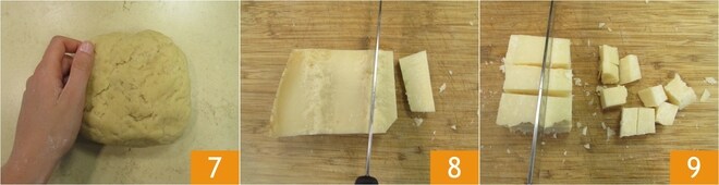 Continue trabalhando até obter uma massa homogênea; para maior comodidade, você pode transferir para a superfície de trabalho 7. Envolva a massa em filme plástico e deixe esfriar na geladeira enquanto continua com a receita. Corte o Grana Padano DOP em pedaços grandes 8 9 e dedique-se à preparação da mousse.