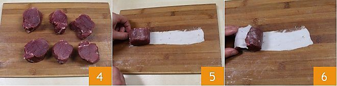 procurando obter porções da mesma espessura para facilitar o cozimento 4. Coloque as fatias de toucinho sobre uma tábua e enrole-as em volta dos pedaços de carne (5-6) de modo a revestir toda a borda dos pedaços.