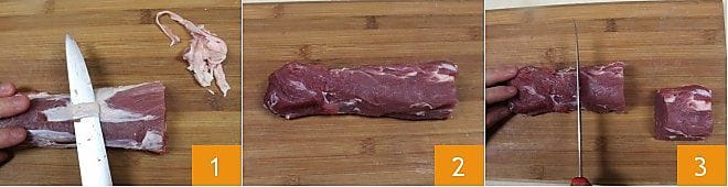 Para preparar os tournedos ao molho de pimenta rosa e sal negro do Havaí, a primeira coisa a fazer é preparar os tournedos: pegue o filé de porco, remova a parte externa mais gordurosa com uma faca bem afiada 1, de modo a obter um filé sem gordura 2, corte em fatias de cerca de 3 cm de espessura 3