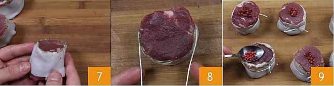 Uma vez terminado 7, envolva a borda com um barbante de cozinha 8. Pressione alguns grãos de pimenta rosa na superfície dos tournedos 9.