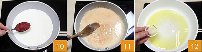 Comece preparando o molho: coloque o creme de leite em uma panela, aqueça-o e adicione o extrato de tomate 10 e o iogurte que você irá misturar em fogo baixo 11. Ajuste o sal e deixe engrossar, então desligue o fogo. Em uma frigideira, aqueça o óleo junto com o dente de alho inteiro 12 (ou seja, com a casca) esmagado com as costas de uma faca de cozinha,