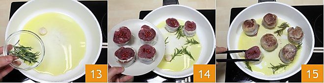 adicione o alecrim 13 e então coloque os tournedos 14. Doure os filés em ambos os lados até atingir o ponto de cozimento desejado 15; para um cozimento médio levará cerca de 5-6 minutos.