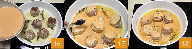 Adicione na frigideira o molho previamente preparado 17, misture bem e deixe descansar por um minuto mantendo tudo aquecido 12. Polvilhe os tournedos com o sal negro do Havaí e sirva os pedaços bem quentes 18.