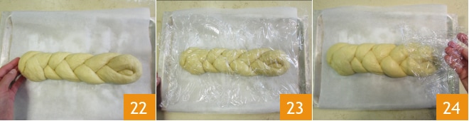 Transfira para uma assadeira forrada com papel manteiga 22 e deixe crescer por mais 30 min coberta com filme plástico 23. Quando estiver bem crescida, remova delicadamente o filme 24.