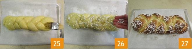 Pincele a superfície com um ovo batido 25 e decore com açúcar granulado 26. Asse em forno estático a 170°C por cerca de 35 min, na prateleira do meio. Deve ficar macia, mas bem assada e dourada na superfície 27.