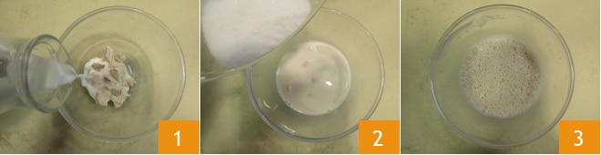 Para preparar a trança de massa fermentada, comece derretendo a manteiga e deixe esfriar. Depois, aqueça o leite e despeje em uma tigela onde você já esfarelou o fermento biológico 1, adicione o açúcar 2 e misture tudo até que esteja dissolvido 3.