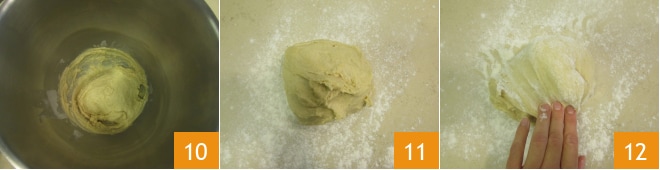 Comece a trabalhar os ingredientes com o gancho até obter uma massa lisa e homogênea. Deve ficar macia, mas bem incorporada 10. Transfira a mistura para a superfície de trabalho levemente enfarinhada 11 e molde rapidamente com as mãos 12.