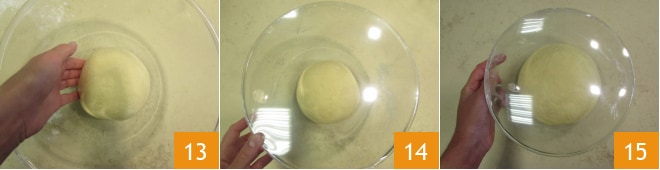 Transfira a massa para uma tigela 13 e cubra com filme plástico 14. Deixe crescer a cerca de 25°C por 90 min 15.