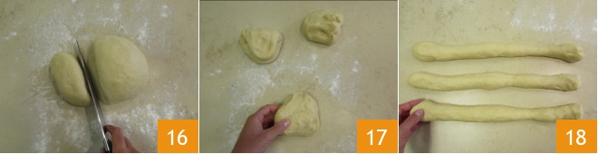 Após o tempo, transfira a massa para a superfície de trabalho levemente enfarinhada e divida a massa em três partes iguais, de cerca de 200 g cada 16 17. Forme rolos de 35 cm 18