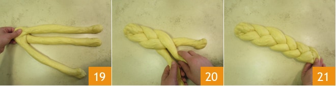 e faça uma trança. Para isso, sele uma das extremidades dos 3 rolos juntos 19 e comece a trançá-los 20. Uma vez que a trança estiver pronta, prenda bem as extremidades 21.