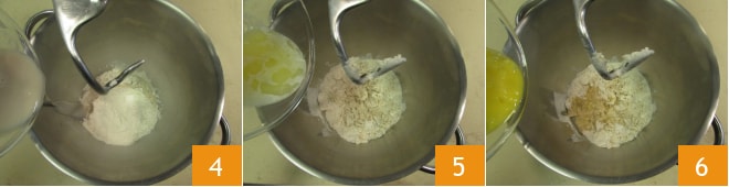 Despeje a farinha peneirada na tigela da batedeira, adicione a mistura de leite e fermento 4 e acrescente a manteiga derretida 5. Bata os dois ovos e adicione aos ingredientes na batedeira 6