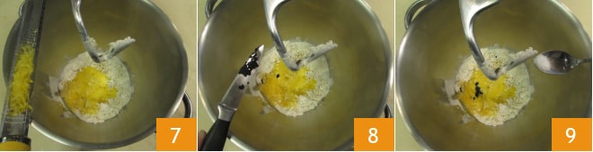 junto com as raspas de meio limão 7, as sementes de uma fava de baunilha 8 e o sal 9.