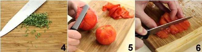 Agora, pique o tomilho 4 e reserve 4 raminhos. Lave os tomates e escalde-os em água fervente por cerca de 15-30 segundos. Quando os tomates estiverem frios: descasque-os 5, elimine o excesso de água e corte-os em cubos 6.