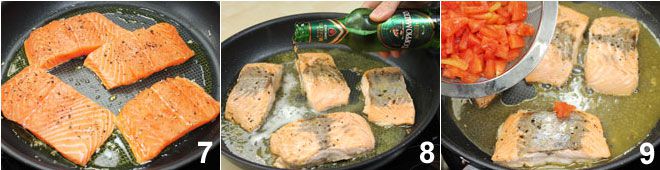 Coloque os escalopes de salmão em uma frigideira antiaderente com um pouco de óleo 7 e cozinhe em fogo alto por 2 minutos de cada lado com um dente de alho esmagado. Agora, deglace com a cerveja doppio malto 8 e deixe evaporar até obter um molho denso. Adicione os tomates 9 e o tomilho picado e deixe cozinhar por cerca de 5 minutos (não cozinhe demais, os tomates não devem desmanchar). Sirva a sua posta de salmão e o seu molho em um prato de servir e decore tudo com raminhos de tomilho.