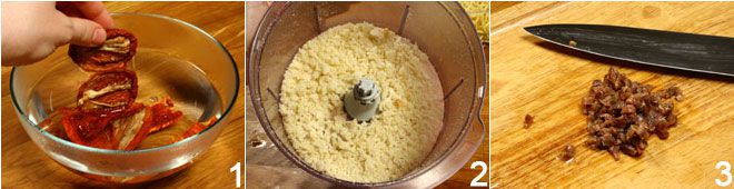 Coloque os tomates secos de molho em uma tigela com água bem quente 1 até que fiquem hidratados (10-15 minutos). Enquanto isso, retire a crosta do pão e esfarele o miolo em pedaços finos usando as lâminas de um processador de alimentos 2. Escorra as anchovas do óleo e pique-as finamente 3;