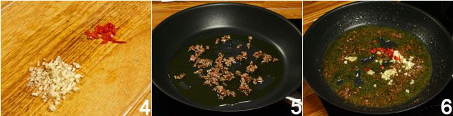 pique também o dente de alho e a pimenta, após remover as sementes internas 4. Coloque em uma frigideira 3 colheres de sopa de óleo e refogue as anchovas em fogo baixo até que se desmanchem 5, depois adicione o alho e a pimenta picados 6.