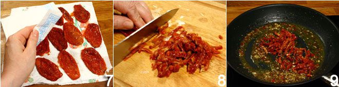 Escorra bem os tomates secos hidratados, seque-os com papel toalha 7 e corte-os em tiras finas 8; adicione-os e salteie por alguns segundos com os outros ingredientes na frigideira 9.