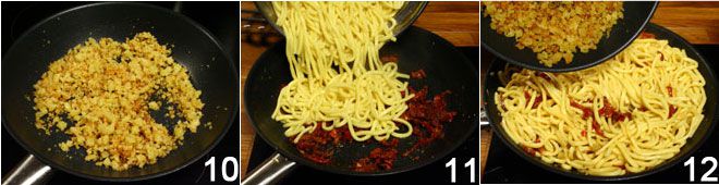 Em outra frigideira, coloque 3 colheres de sopa de óleo e doure o miolo do pão 10 até que fique crocante. Enquanto isso, cozinhe os troccoli em água ligeiramente salgada (devido ao alto grau de sal do condimento), escorra-os e salteie por alguns segundos na frigideira com a mistura de tomates secos 11, adicionando, se necessário, algumas colheres de sopa de água do cozimento para misturar tudo. Quando já tiver desligado o fogo, adicione a farinha de rosca crocante 12, então emprate e sirva imediatamente.