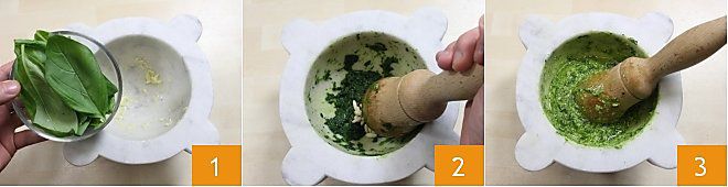 Para preparar as trofie alla Portofino, comece pela preparação do pesto seguindo a receita do Pesto alla Genovese. Pegue um pilão (alternativamente, se não tiver um pilão, pode usar o mixer), coloque dentro o alho, comece a triturar para picá-lo, depois adicione as folhas de manjericão 1 junto com uma pitada de sal grosso. Esmague o manjericão contra as paredes do pilão girando o pilão da esquerda para a direita e simultaneamente gire o pilão no sentido contrário (da direita para a esquerda). Quando as folhas de manjericão liberarem um líquido verde brilhante, adicione os pinhões e recomece a triturar. Adicione os queijos e por último o azeite de oliva extravirgem que deve ser despejado aos poucos, sempre misturando com o pilão. Misture bem os ingredientes até obter um molho homogêneo 3. O pesto está pronto, reserve-o.