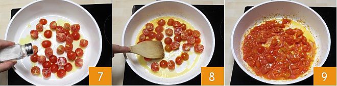adicione sal 7 e cozinhe os tomatinhos em fogo moderado 8 até que se desmanchem 9.
