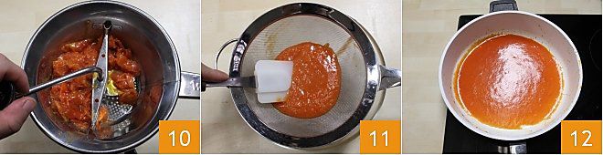 Neste ponto, coloque os tomates em um passe-vite 10. Para obter o molho, passe-os por uma peneira 11 para eliminar as sementes e coloque-o novamente na frigideira 12.