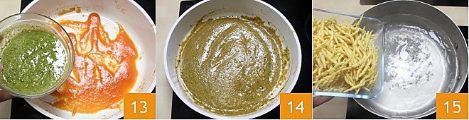 Agora adicione ao molho de tomate obtido o pesto previamente preparado 13. Misture para obter um molho bem homogêneo 14. Por fim, prepare as trofie: coloque uma panela com bastante água salgada no fogo, leve à fervura e adicione as trofie 15,