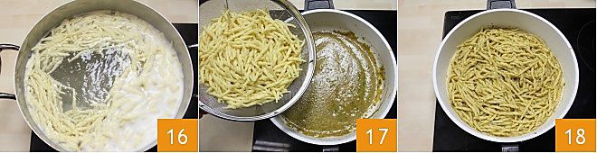 cozinhe as trofie 16. Quando estiverem cozidas, escorra as trofie e adicione-as ao molho de pesto e tomate 17. Misture bem para aromatizar a massa 18 e sirva as trofie alla Portofino bem quentes.