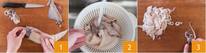 Para preparar as trofie ao forno com lulas e couve-flor, primeiro prepare todos os ingredientes. Para limpar as lulas, comece destacando delicadamente a cabeça do manto, depois remova a pele e extraia a pena de cartilagem que está dentro 1. Lave as lulas limpas em água corrente 2, depois corte em pedaços tanto o manto quanto os tentáculos 3. Para mais informações sobre o procedimento, você pode consultar nosso guia sobre como limpar lulas.