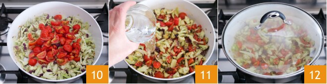 Adicione também os tomates 10, sal, pimenta e despeje a água 11, depois abaixe o fogo, cubra com uma tampa 12 e cozinhe por cerca de 20 minutos.