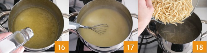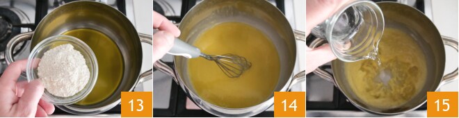 Enquanto isso, leve uma panela de água para ferver para cozinhar a massa e prepare o molho bechamel à base de água: despeje a farinha e o óleo em uma panela pequena 13 e misture com um batedor em fogo baixo por alguns minutos 14, depois apague o fogo e despeje a água 15.