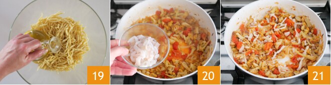 Depois de escorrer as trofie, coloque-as em uma tigela grande e tempere com um fio de azeite para não grudarem 19. Quando os 20 minutos de cozimento do molho se passarem, adicione as lulas 20 e cozinhe por mais 5-7 minutos 21.