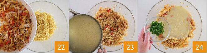 Despeje o molho na tigela com a massa 22 junto com o molho bechamel 23 e a salsinha picada 24, depois misture bem para incorporar tudo.