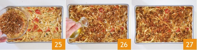 Transfira a massa assim temperada para uma assadeira e polvilhe com farinha de rosca na superfície 25, depois tempere com um fio de azeite 26. Asse em forno ventilado pré-aquecido a 200° por cerca de 10 minutos, até que fique bem dourado na superfície. Retire suas trofie ao forno com lulas e couve-flor do forno e sirva 27!