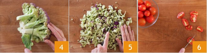 Elimine a base e as folhas da couve-flor, depois separe as florezinhas (você deve obter cerca de 500 g utilizáveis) 4 e corte-as também em pedaços 5. Divida os tomatinhos em quartos 6.