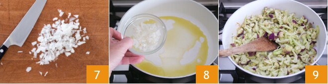 Finalmente, pique finamente a cebola 7. Agora aqueça um fio de azeite em uma frigideira grande e refogue brevemente a cebola 8, depois adicione a couve-flor e deixe apurar por alguns minutos 9.