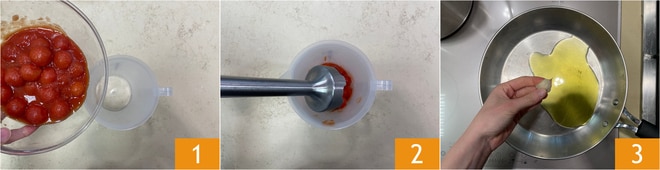 Para preparar as trofie ao molho de bacalhau, comece dessalgando as alcaparras (basta enxaguá-las bem em água corrente), depois despeje os tomatinhos em conserva em um copo alto 1 e bata com um mixer de imersão até obter um molho homogêneo 2. Em uma frigideira grande, aqueça um pouco de azeite e frite o dente de alho com casca 3.