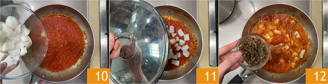 Adicione o bacalhau ao molho de tomatinhos 10, misture e continue cozinhando sempre com a tampa por mais 5 minutos ou até que esteja macio (deve desmanchar ao tocar com a colher) 11. No final do cozimento, adicione a mistura de alcaparras e azeitonas 12.