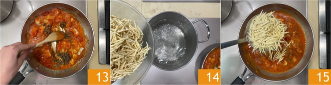 Misture 13 e remova o dente de alho. Enquanto isso, cozinhe as trofie em abundante água salgada a gosto 14, depois escorra al dente e transfira para a frigideira com o molho 15, e cozinhe por mais 2 minutos.
