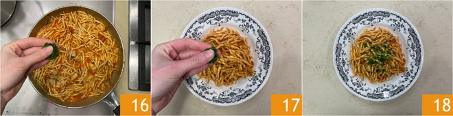 Desligue o fogo, tempere com a salsa picada 16, misture tudo com um fio de azeite e sirva suas trofie ao ragu de bacalhau, adicionando a gosto mais salsa fresca picada finamente 17 18.