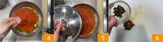 Em seguida, despeje o molho de tomatinhos, ajuste o sal 4 e a pimenta e cozinhe com a tampa por cerca de 20 minutos 5. Sobre a tábua, disponha as azeitonas taggiasche escorridas e as alcaparras dessalgadas 6.