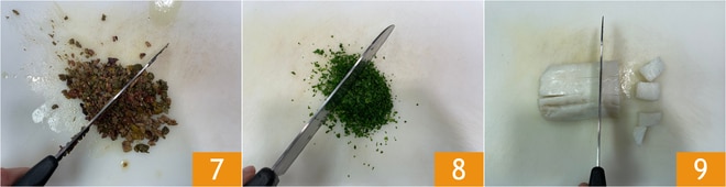 Pique tudo finamente com uma faca 7, depois faça o mesmo com a salsa 8. Reserve e corte o filé de bacalhau em cubos 9.