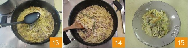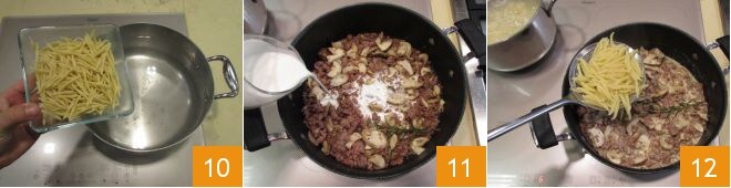 Assim que a água estiver quente, coloque as trofie 10. Enquanto isso, despeje o creme de leite na panela com o molho e rale um pouco mais de pimenta 11. Assim que as trofie estiverem cozidas, escorra-as na panela 12.