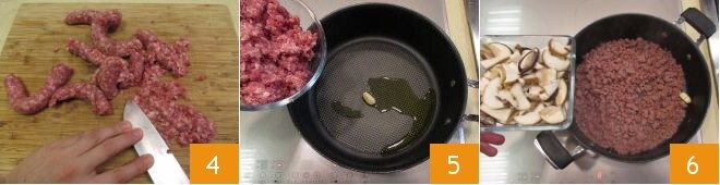 Agora vamos ao cozimento. Numa panela, aqueça um fio de azeite e doure um dente de alho com casca. Assim que o fundo estiver quente, adicione a linguiça, sem a tripa e esfarelada 4. Deixe dourar suavemente a carne e, em seguida, aumente a chama antes de adicionar os cogumelos 5. Dê uma leve refogada e, quando o líquido de cozimento sair, retire o alho 6.